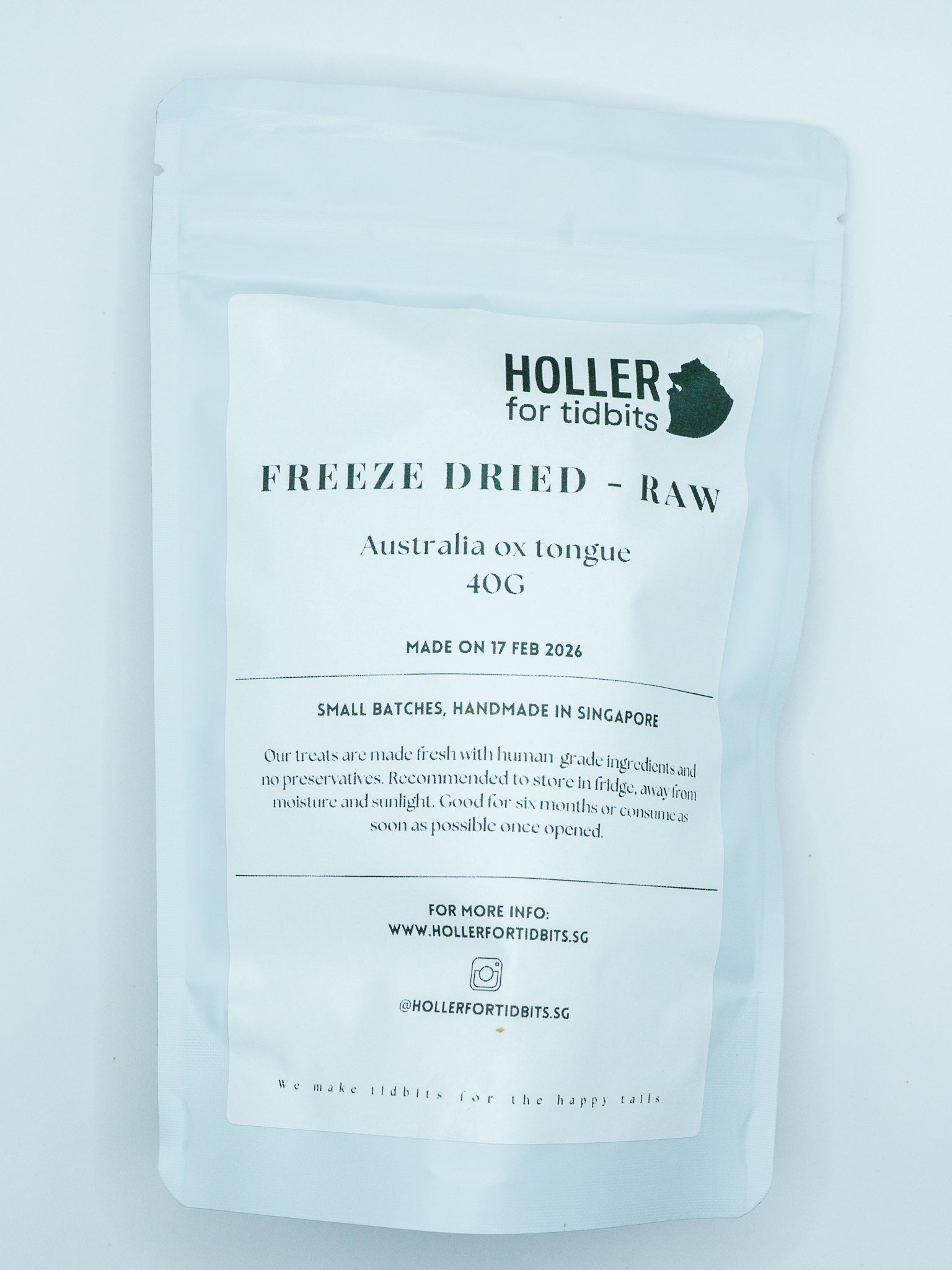 Our treats are made fresh in Singapore, with no preservatives added. Recommended to store in fridge, away from moisture and sunlight.