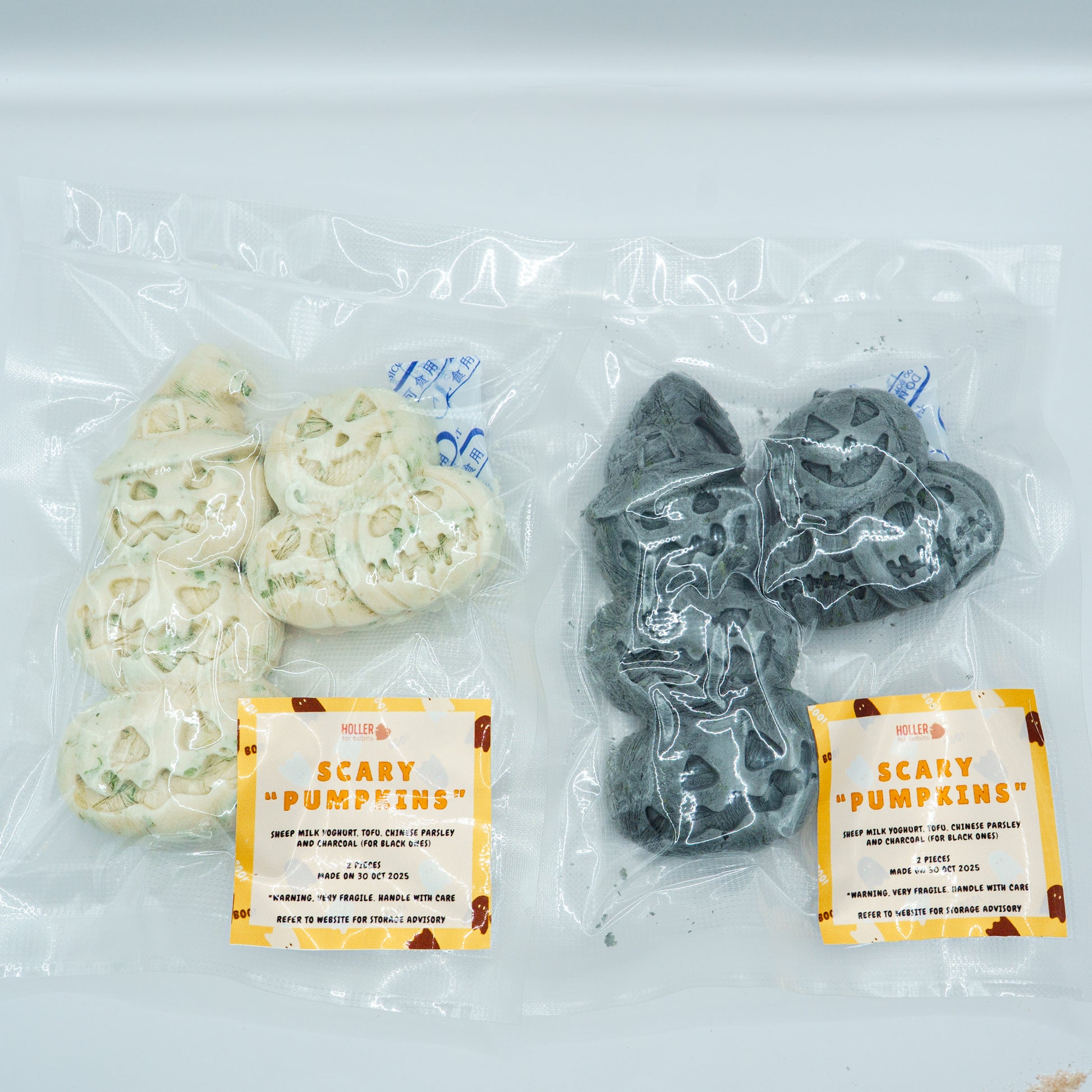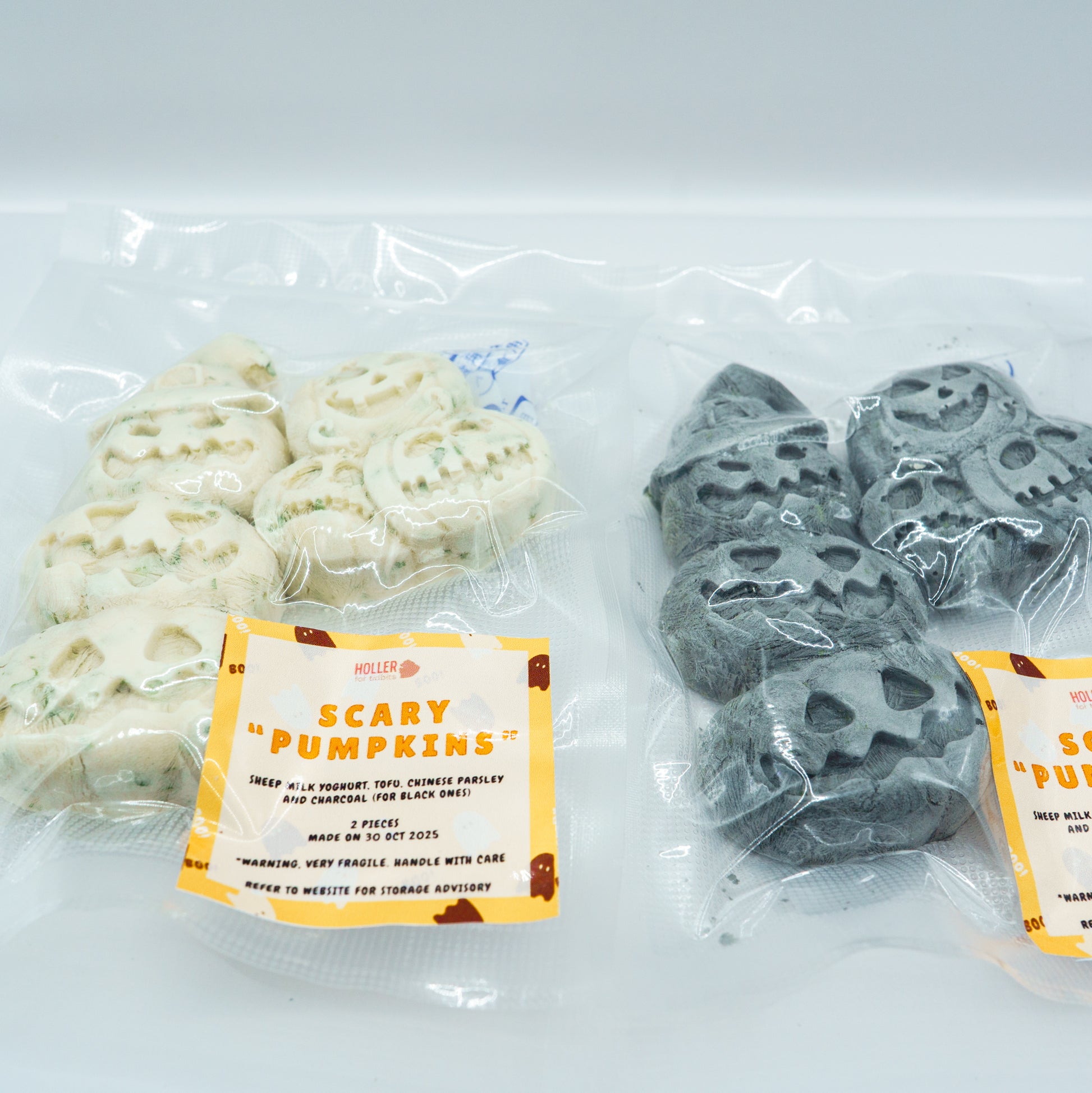 Freeze dried, sheep milk yoghurt with tofu, chinese parsley and charcoal (black).